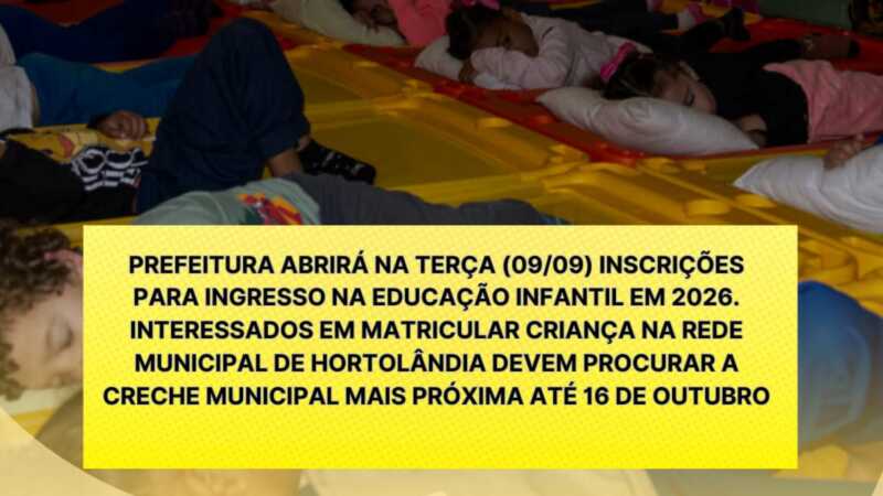 Prefeitura DE HORTOLÂNDIA abrirá na terça (09/09) inscrições para ingresso na Educação Infantil em 2026
